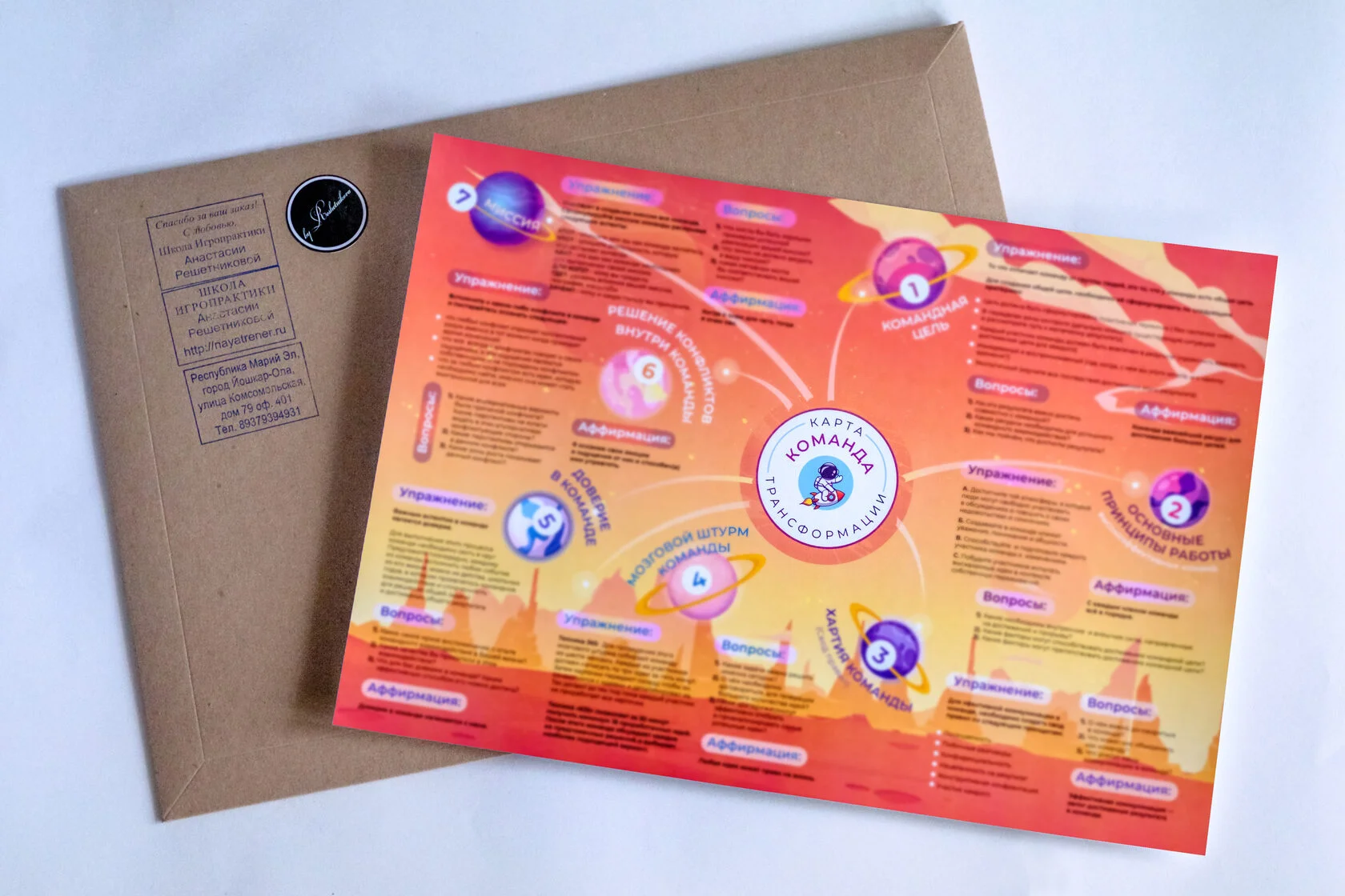 1 карта с 7 секторами (каждый сектор — упражнение, рекомендация, коучинговые вопросы и аффирмация).