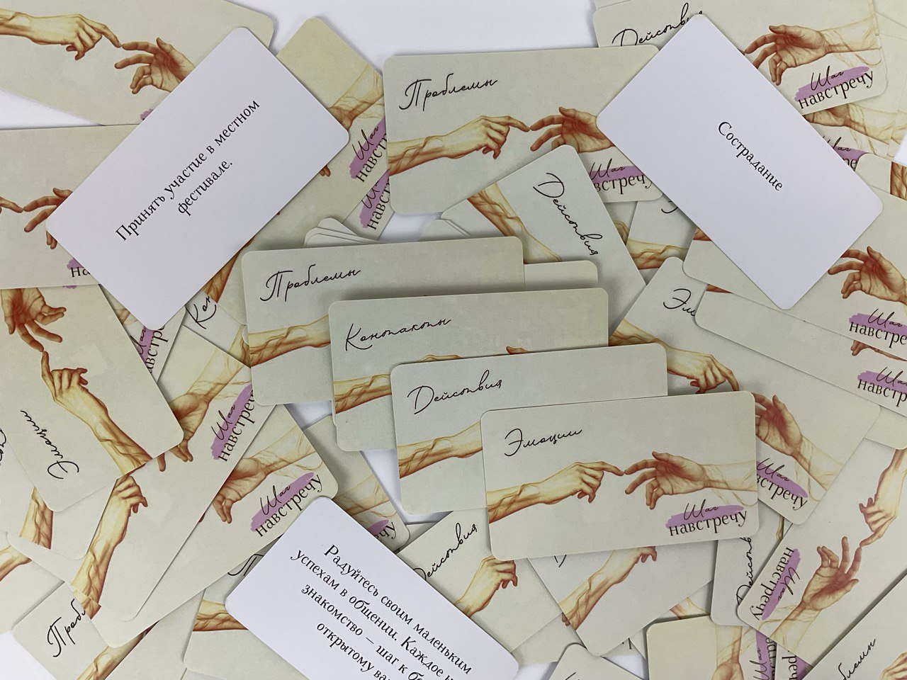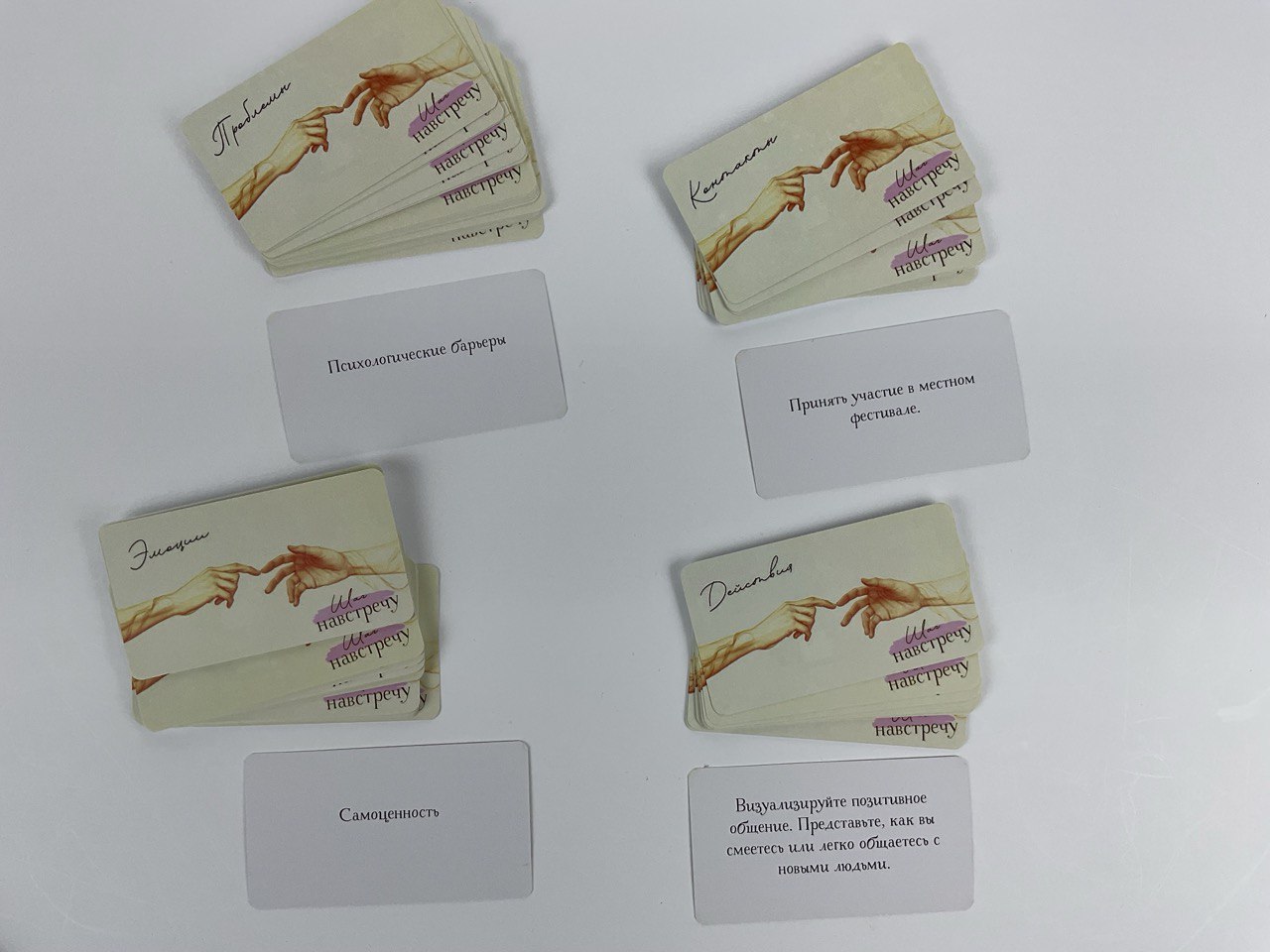 Колоды: «Эмоции», «Контакты», «Проблемы», «Действия»; бумага и ручка для записей.